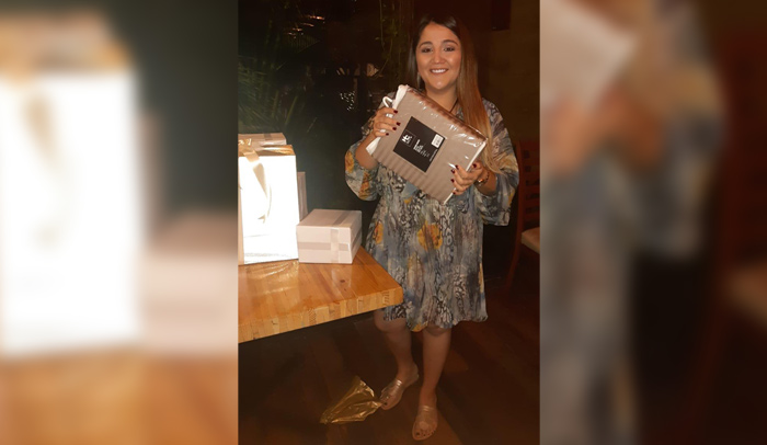 Catalina Mantilla abriendo los regalos que con mucho cariño le obsequiaron sus amigas.