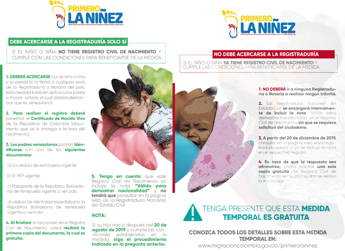 Para hacer este trámite, los padres venezolanos deberán acercarse con el niño a cualquier sede de la Registraduría o Notaría en Colombia y presentar el Certificado de Nacido Vivo de su hijo, así como identificarse con su cédula venezolana, el pasaporte vigente o vencido, entre otros documentos.