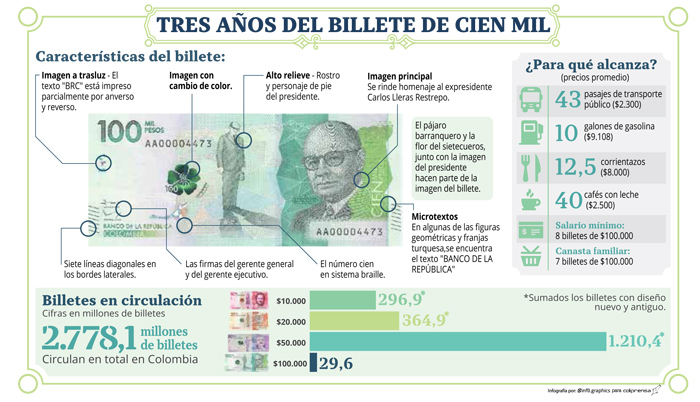 “Los colombianos no han visto mucho este billete porque del total de piezas emitidas por el Banco de la República, aproximadamente 29 millones de piezas corresponden a los billetes de 100.000 pesos, lo cual es muy bajo y representa un porcentaje menor en la economía y no se ve frecuentemente en el mercado. Además, tenemos que tener en cuenta que este tipo de billetes de alta denominación tiene una muy baja demanda en las transacciones pequeñas y solamente está siendo utilizado para transacciones grandes”, explicó Vera.