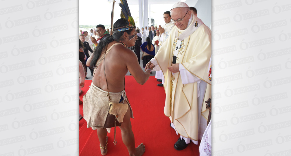 Unos 1.500 indígenas llegaron a Villavicencio, a 70 km de Bogotá, para encontrar al papa. Representantes de etnias le hicieron un pasillo de honor su ingreso a la misa y subieron al altar.