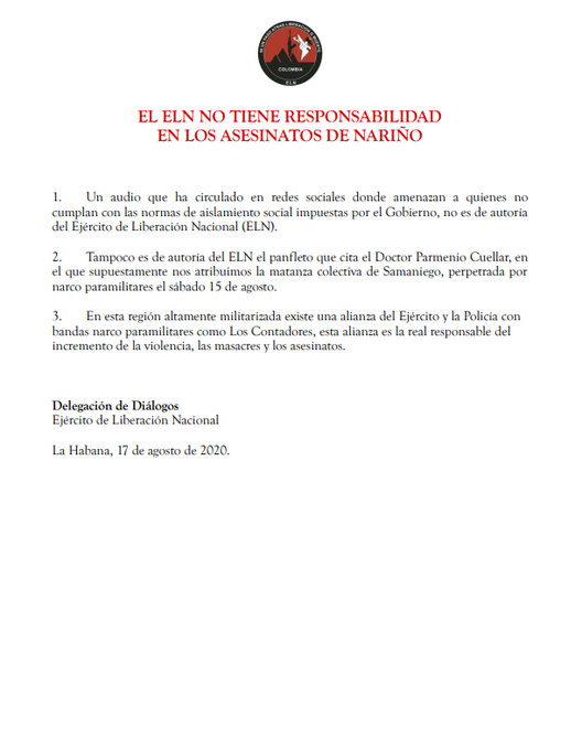 “Tampoco es de autoría del ELN el panfleto que cita el Doctor Parmenio Cuellar, en el que supuestamente nos atribuimos la matanza colectiva de Samaniego, perpetrada por narcoparamilitares el sábado 15 de agosto”, afirmó el ELN.