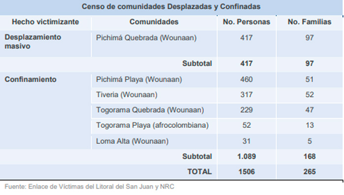 Según la Alerta Temprana emitida por la Defensoría del Pueblo sobre el confinamiento, las comunidades presentan riesgos de protección por la exposición a amenazas, reclutamiento forzado, violencia y abuso sexual tanto contra mujeres mayores como menores de edad; de igual manera, las restricciones a la movilidad en horarios establecidos han desencadenado restricciones de acceso a medios de vida y abastecimiento alimentario; este escenario incrementa las condiciones de vulnerabilidad y temor en la población en las comunidades afectadas.
