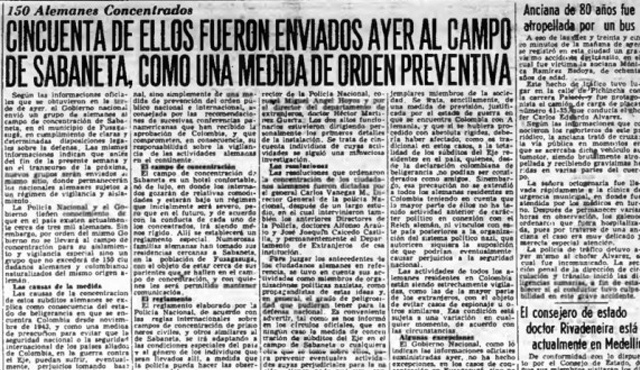 “Según las informaciones oficiales que se obtuvieron en la tarde de ayer, el Gobierno Nacional envió un grupo de alemanes al campo de concentración de Sabaneta, en el municipio de Fusagasugá, en cumplimiento de claras y determinadas disposiciones legales sobre la defensa. Las mismas informaciones indican que antes del fin de la presente semana y en el transcurso de la próxima, nuevos grupos serán enviados al mismo sitio, donde permanecerán los nacionales alemanes sujetos a un régimen de vigilancia y aislamiento”.