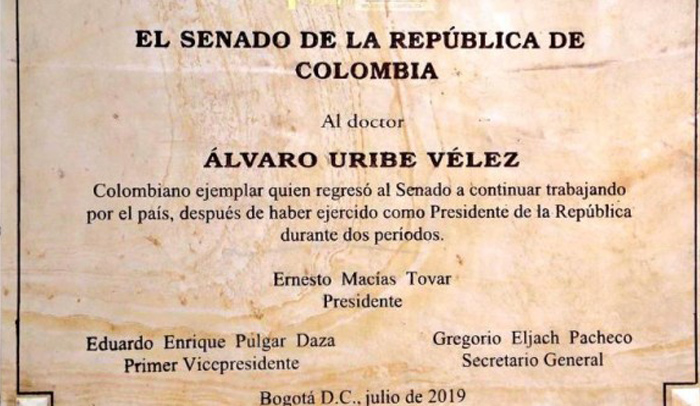 En la lámina se lee: “Al doctor Álvaro Uribe Vélez, colombiano ejemplar que regresó al Senado a continuar trabajando por el país, después de haber ejercido como Presidente de la República durante dos periodos”.