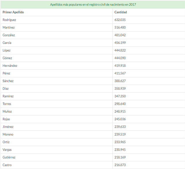 En cuanto a los apellidos más populares en los niños registrados este año, Rodríguez sigue siendo el que más aparece en los registros civiles de nacimiento. A este le siguen Martínez, González y García.