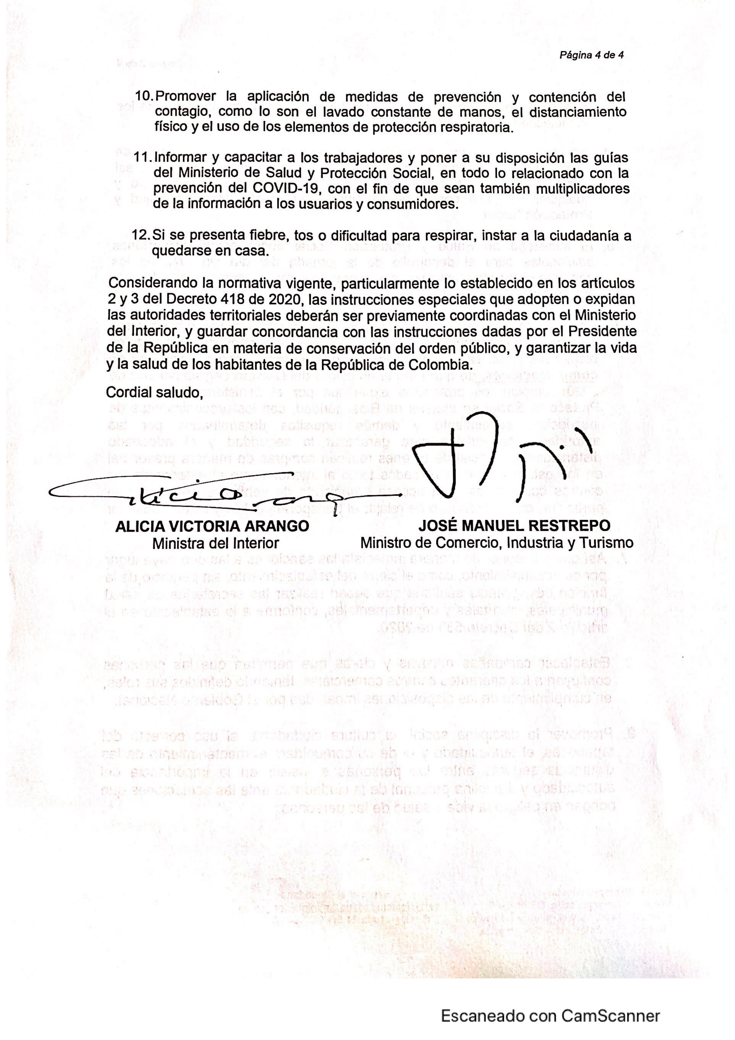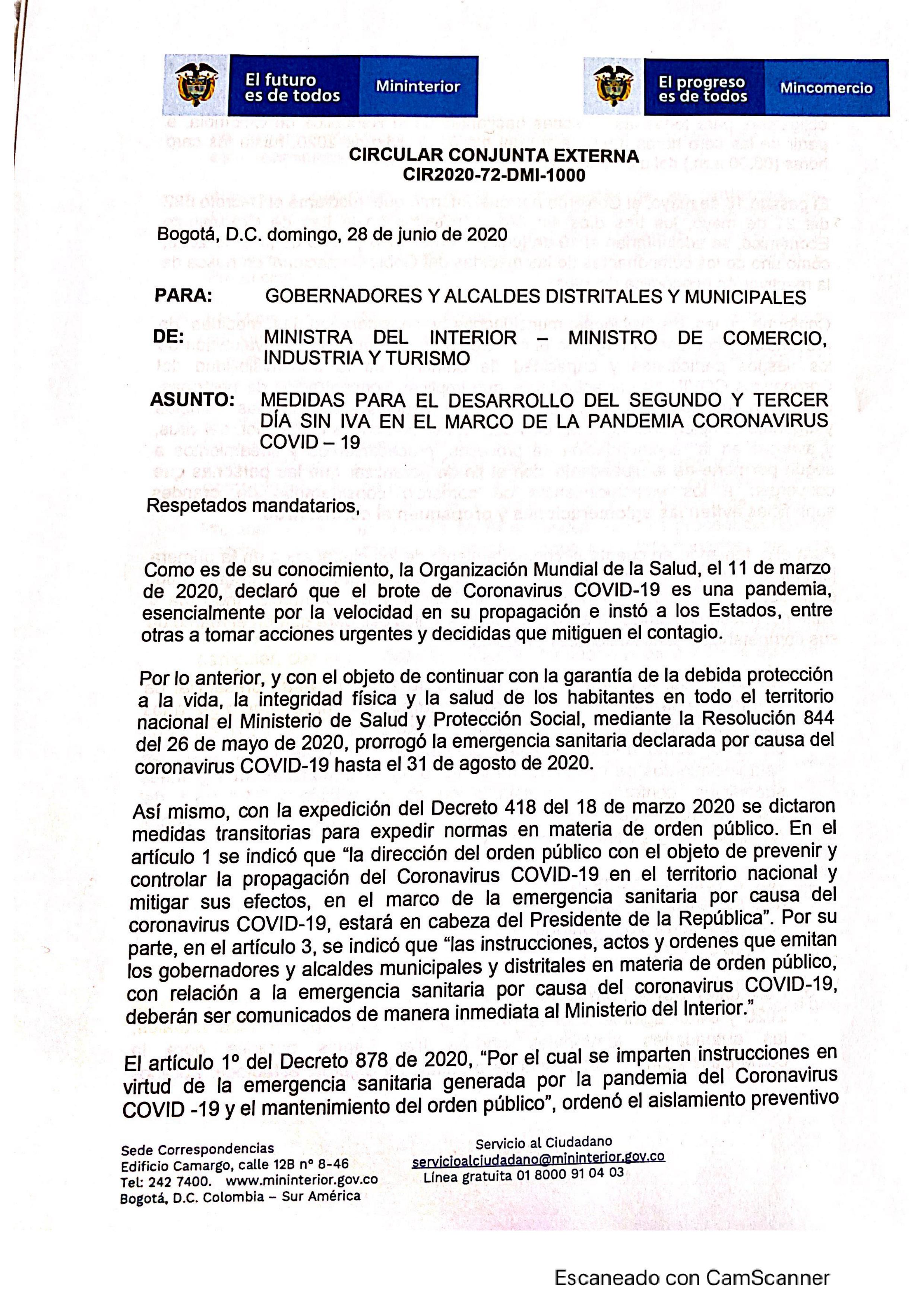 La circular externa firmada por la ministra del Interior, Alicia Arango, y de comercio, Industria y Turismo, José Manuel Restrepo, se solicita a los gobernadores y alcaldes distritales y municipales las medidas para el desarrollo de los dos días sin IVA del 3 y 19 de julio.