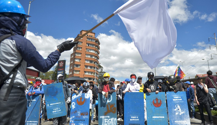 Colombia. Primera Línea: "Defendemos a la gente porque el gobierno tiene a la policía militar para que defienda sus intereses." pic.twitter.com/QIl6TcOKvJ
