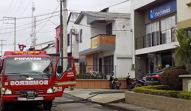 Mientras esto sucedía, integrantes de Bomberos Popayán evacuaron las instalaciones de Medimás, indicándoles a los presentes y a los trabajadores que se alejaran de la zona porque era penetrante el olor a gasolina. Luego acordonaron el lugar para después descontaminar la sede recurriendo a un pequeño ventilador y tras rociar aserrín en la amplia macha de gasolina de los dos pisos de la sede, para conjurar el peligro.