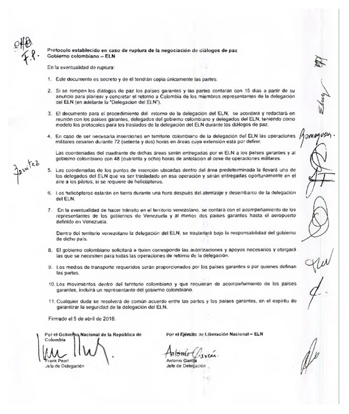 El documento se conoce después de que el Gobierno asegurara que desconoce los protocolos para el levantamiento de la mesa de negociación con el Eln y exigiera Cuba capturar a los miembros del equipo negociador.