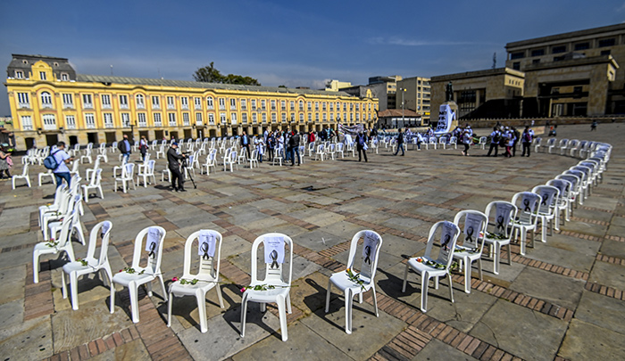 Los manifestantes ubicaron en la plaza 165 sillas blancas que representan el número de trabajadores de la salud fallecidos por el virus en Colombia, que el pasado sábado superó el millón contagios y ya suma 30.154 fallecidos.