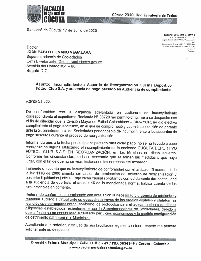 El 20 de abril debió reanudarse la audiencia en la Superintendencia de Sociedades para que el Cúcuta Deportivo demostrara el cumplimiento de pago, con unos recursos que le daría la División Mayor de Fútbol (Dimayor), de la deuda con la Alcaldía y con el IMRD, por el préstamo del estadio General Santander, pero no ocurrió debido la crisis por la pandemia de COVID-19.