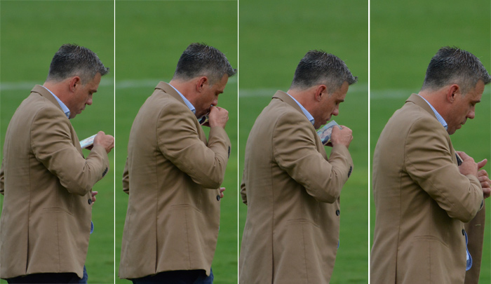 (El estratega argentino hizo su tradicional cábala de besar una fotografía de su abuela durante el encuentro disputado en el General Santander. Foto: Édgar Cusgüen)
