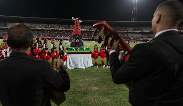 Una réplica de una torta de más de 4 pisos fue puesta en el sector occidental de la cancha junto al grupo de marichsis.