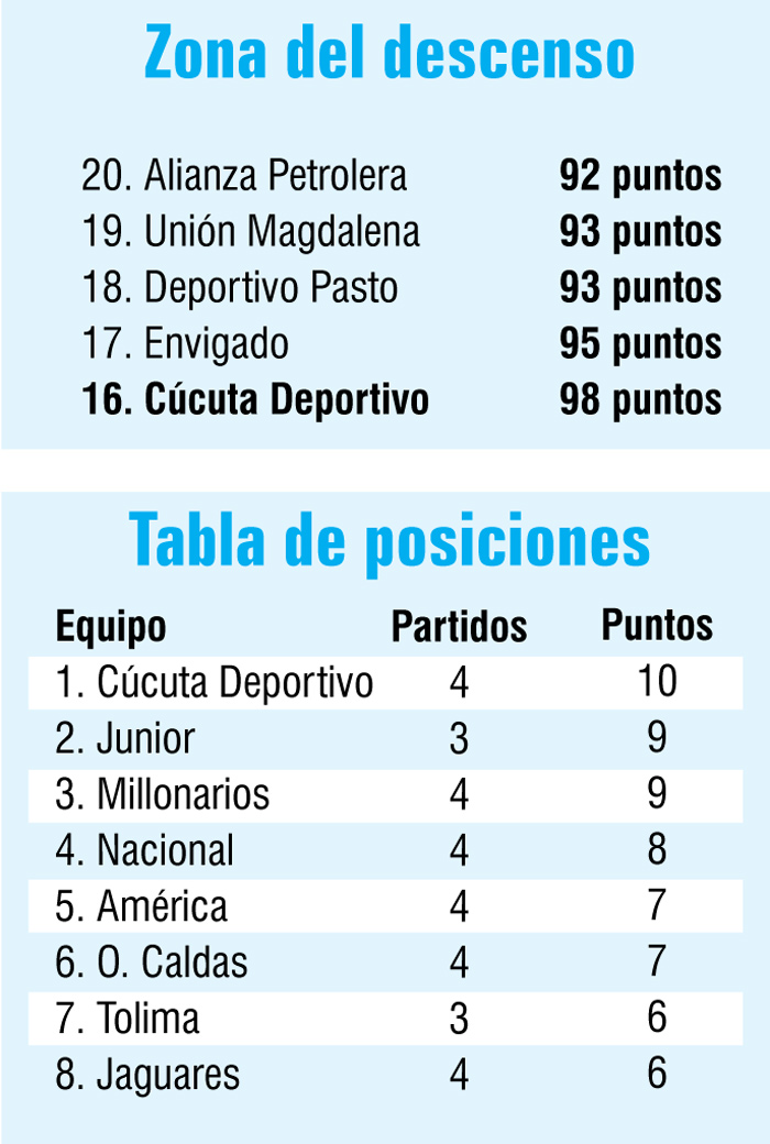 Con los buenos resultados, el Cúcuta Deportivo se ha empezado a alejar de la zona de descenso. Actualmente está a cinco puntos de Alianza Petrolera, que es el primer candidato –hasta ahora- para jugar en la B el próximo año.