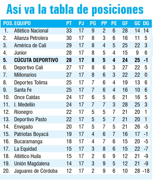 Cúcuta suma 28 unidades en el Finalización 2019 (8V 4E 5D); su mayor cantidad de puntos en 17 partidos jugados en un torneo corto de Primera A desde 2009-I (30 puntos).