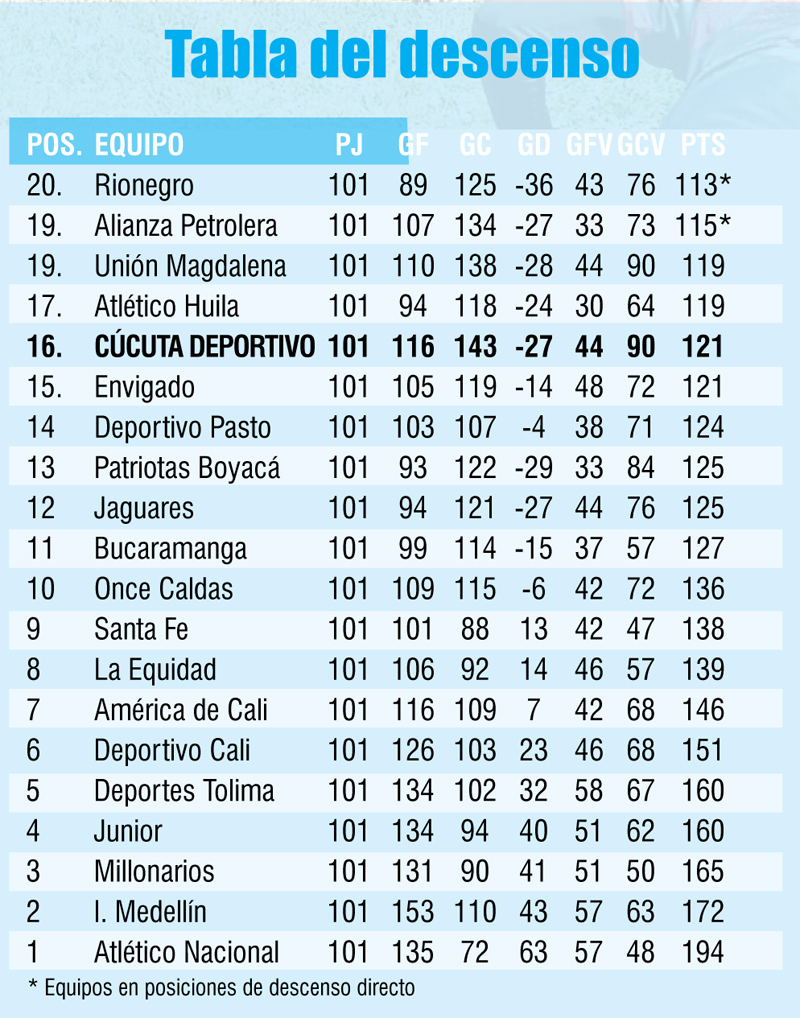 Cúcuta mantiene la necesidad de sumar la mayor cantidad de puntos posibles para salir bien librado del descenso. El equipo motilón con 121 puntos está en la casilla 16 a solo seis de la zona del descenso directo.