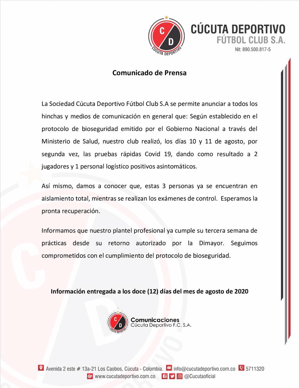 El pasado 22 de julio, el Cúcuta Deportivo reportó un caso positivo asintomático en las primeras pruebas de COVID-19. Esa vez se tomaron 37 muestras en el cuerpo técnico, jugadores, utilería, seguridad, médico, fisioterapeutas, personal de aseo y vigilancia en la Unidad Hematológica Especializada.