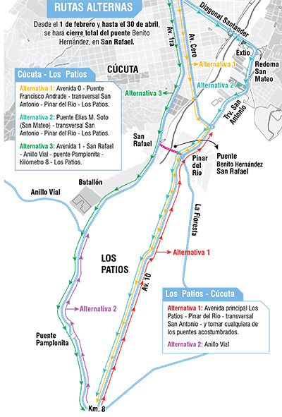 Desde el 1 febrero y hasta el 30 de abril, el puente Benito Hernández, ubicado en San Rafael, será cerrado totalmente para la terminación de las obras de la construcción de la intersección. El puente une a Cúcuta con Los Patios.