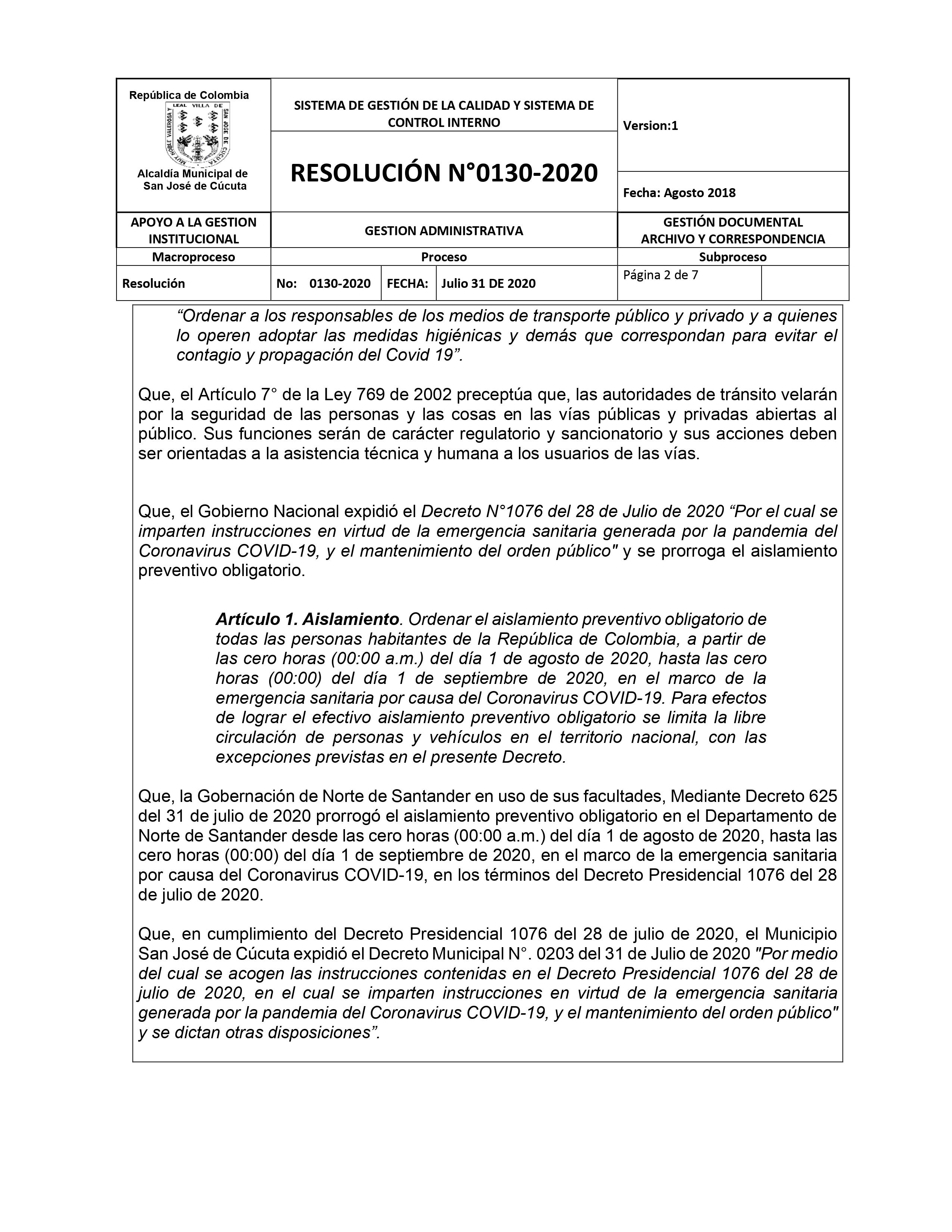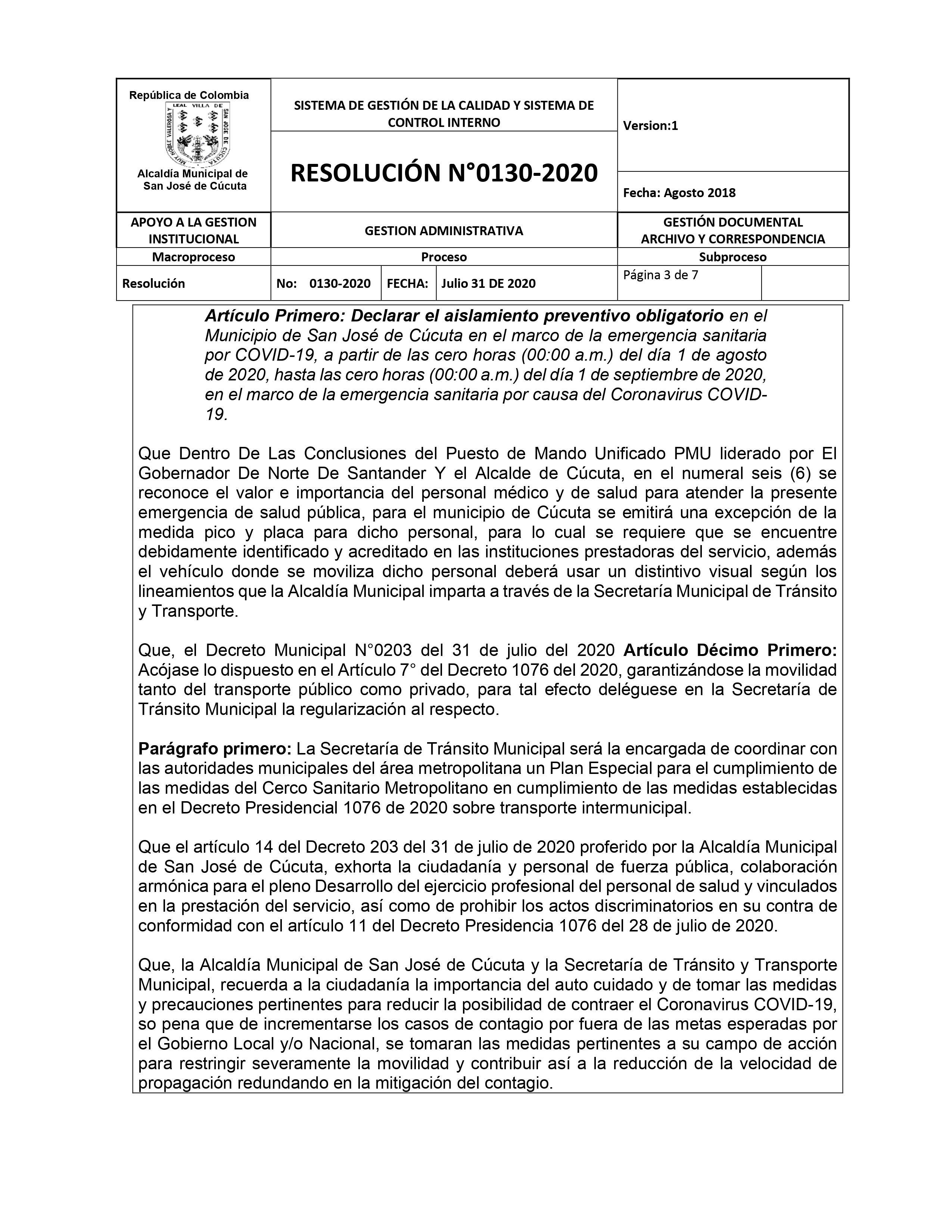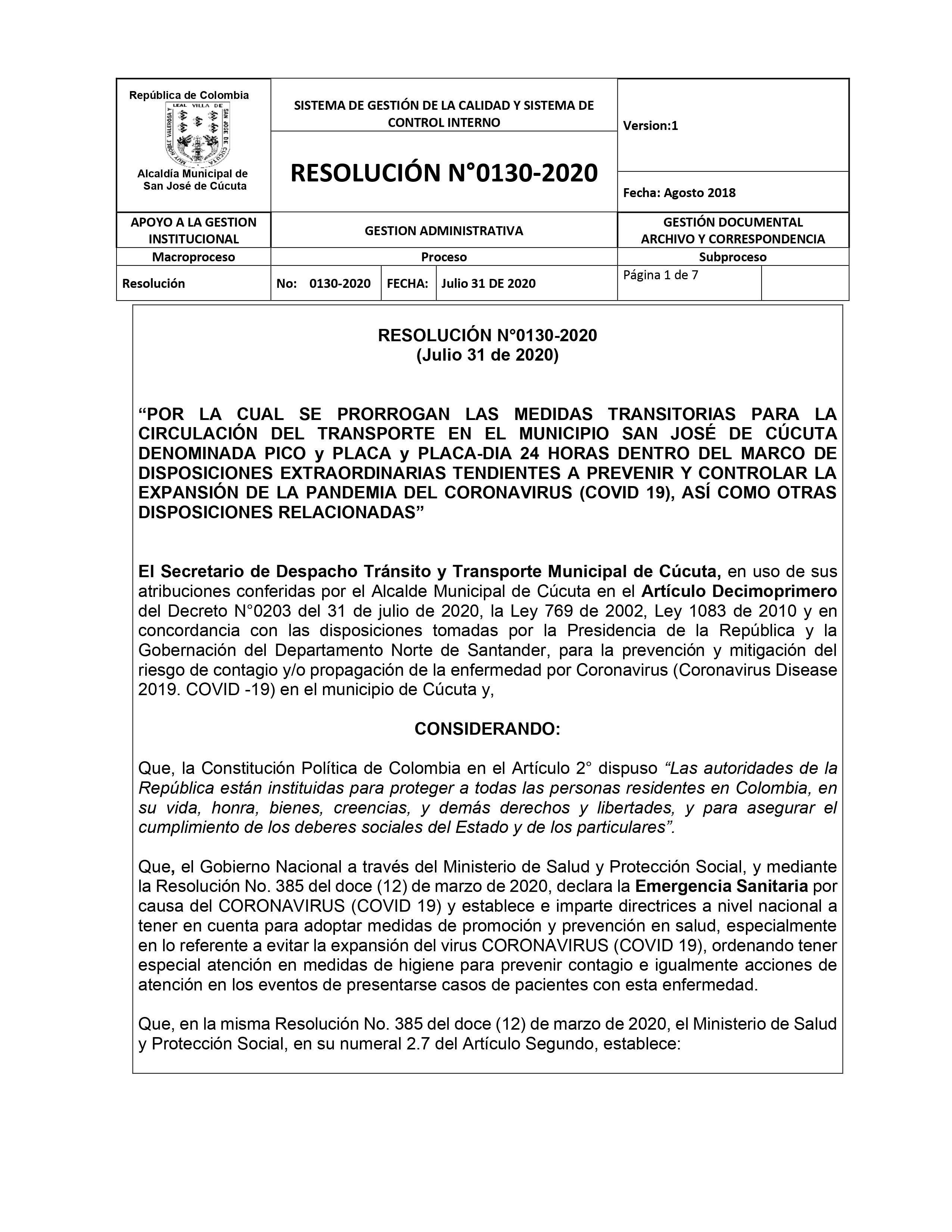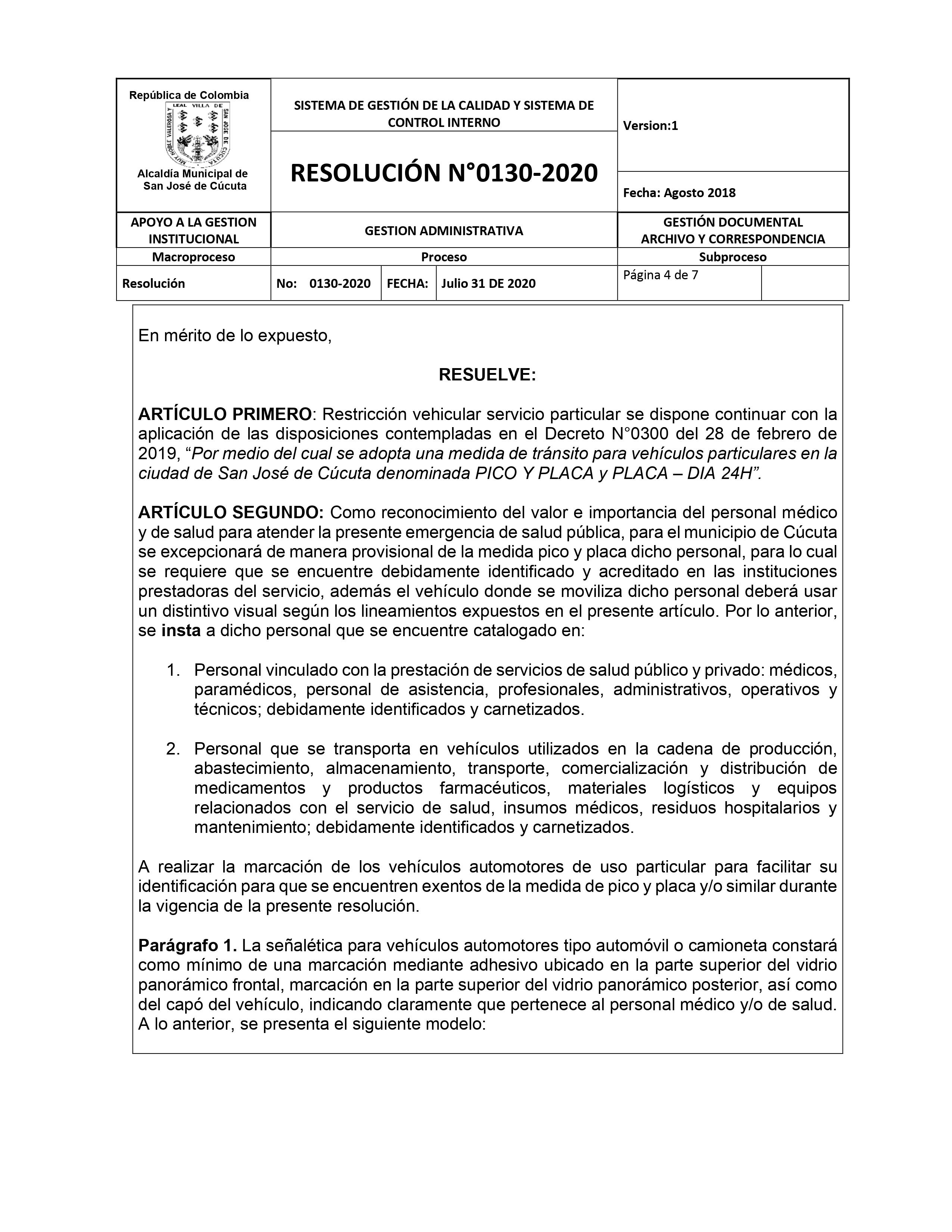 Con la resolución 0130 - 2020, la Secretaría de Tránsito muestra las nuevas medidas en materia de Pico y Placa y Placa Día, para Cúcuta.
