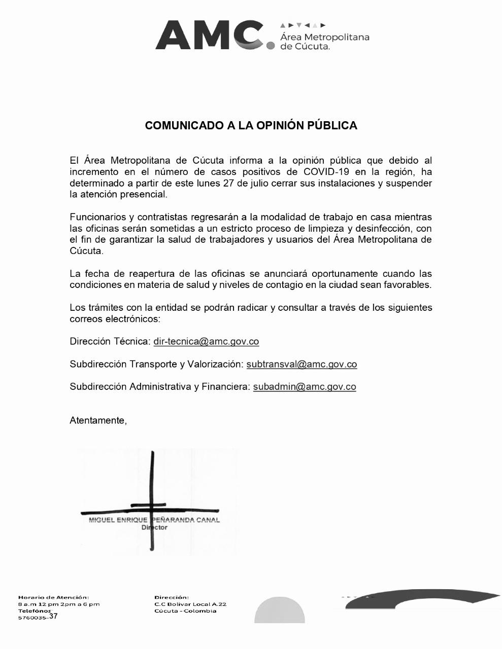 Área Metropolitana de Cúcuta suspende atención presencial por COVID-19