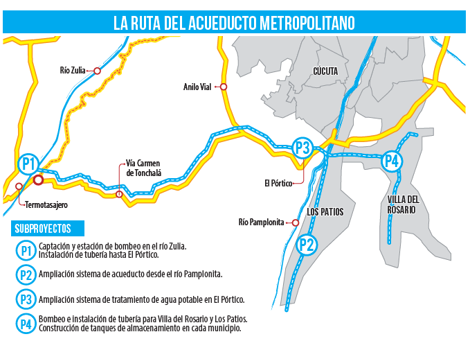 El gerente de construcción de Ecopetrol, Javier Tavera, agregó que el otro subproyecto consiste en construir el sistema de bombeo desde la planta El Pórtico hasta los tanques de almacenamiento que se harán en el sector Cumbres Bajas, en Los Patios; y en Primero de Mayo, en Villa del Rosario.