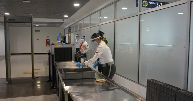 Al final de la encuesta, otra de las siete integrantes del grupo azul y blanco apuntó con el termómetro electrónico al cuello del hombre para tomarle la temperatura. Nueve huellas para entrar al aeropuerto, siete huellas en la cola para entregar el equipaje y siete más para ingresar a la sala de espera, indicando el puesto a tomar y la importancia de los 120 centímetros de separación.