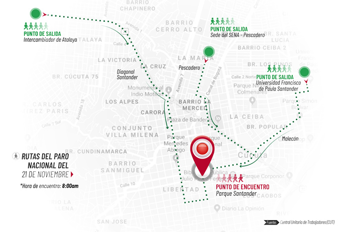 En Cúcuta, las marchas tienen tres puntos de partida. El primero está ubicado en el intercambiador de la ciudadela Juan Atalaya, donde confluirán los integrantes de las centrales obreras y de las organizaciones sociales.