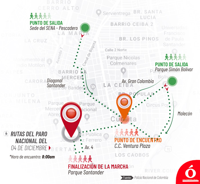 El parque Simón Bolívar y las instalaciones del Servicio Nacional de Aprendizaje (Sena), en el barrio Pescadero, serán los dos puntos de partida de las movilizaciones programadas para este miércoles, 4 de diciembre, en Cúcuta, como parte de la nueva jornada de Paro Nacional que se cumplirá en diferentes regiones del país.