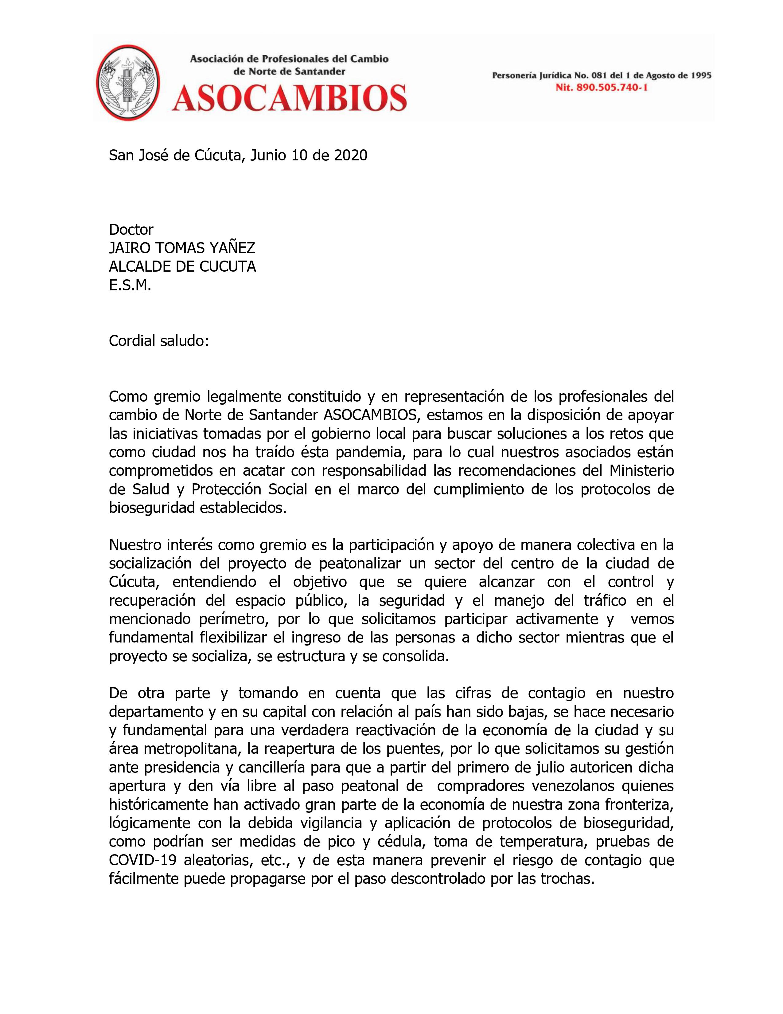 En la misiva le piden a Jairo Yáñez, alcalde de Cúcuta que gestione ante presidencia y cancillería "para que a partir del primero de julio autoricen dicha apertura y den vía libre al paso peatonal de compradores venezolanos quienes históricamente han activado gran parte de la economía de nuestra zona fronteriza, lógicamente con la debida vigilancia y aplicación de protocolos".