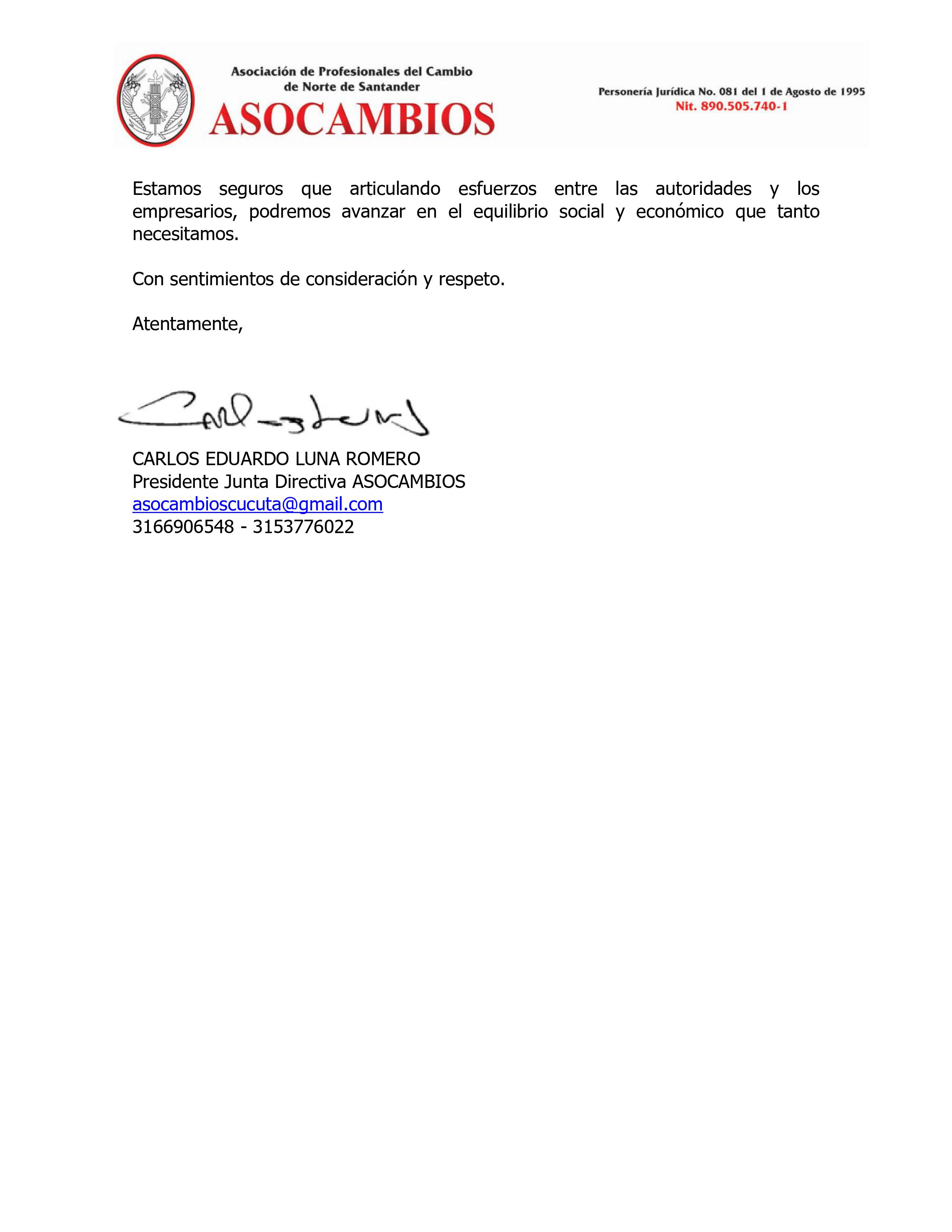 Por medio de un comunicado, la Asociación de Profesionales de Cambio (Asocambios) mostró su apoyo a las recientes decisiones de la Alcaldía de Cúcuta para contener el contagio de la COVID-19.