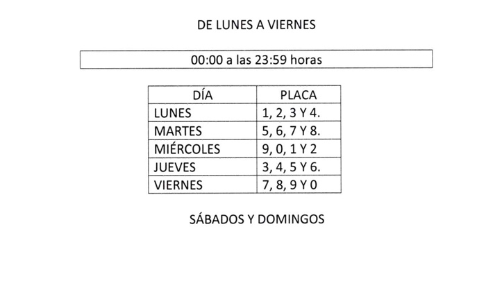 - Sábado, día par del mes: no circulan los vehículos con placa terminada en 2, 4, 6, 8 y 0.