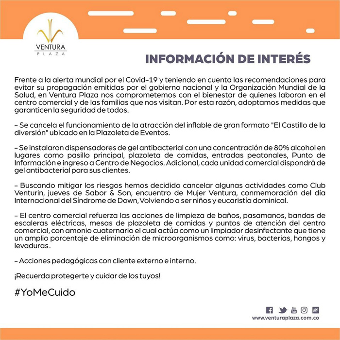 Por otra parte, el centro comercial Ventura Plaza también dio a conocer medidas por el coronavirus.