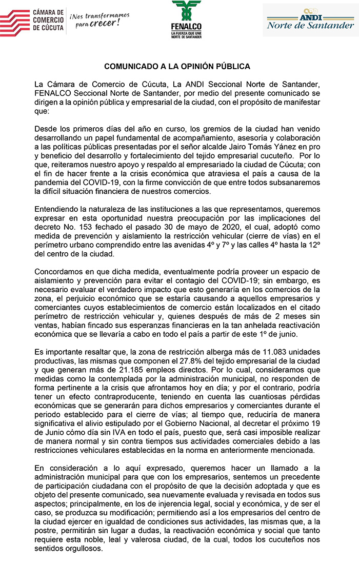 Por medio de un comunicado, la Cámara de Comercio de Cúcuta, La ANDI Seccional Norte de Santander y Fenalco Seccional Norte de Santander, se pronunciaron sobre la medida de restricción a la circulación vehicular en algunas calles del centro de la ciudad.
