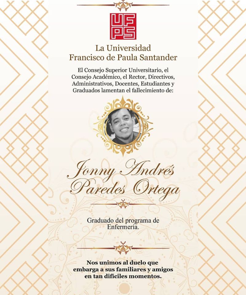 “La comunidad universitaria UFPS Cúcuta lamenta profundamente el fallecimiento del graduado Jonny Andrés Paredes Ortega. Un Héroe de la Salud. Nuestros sentimientos de solidaridad y cercanía, como Familia Institucional”, señaló la institución.