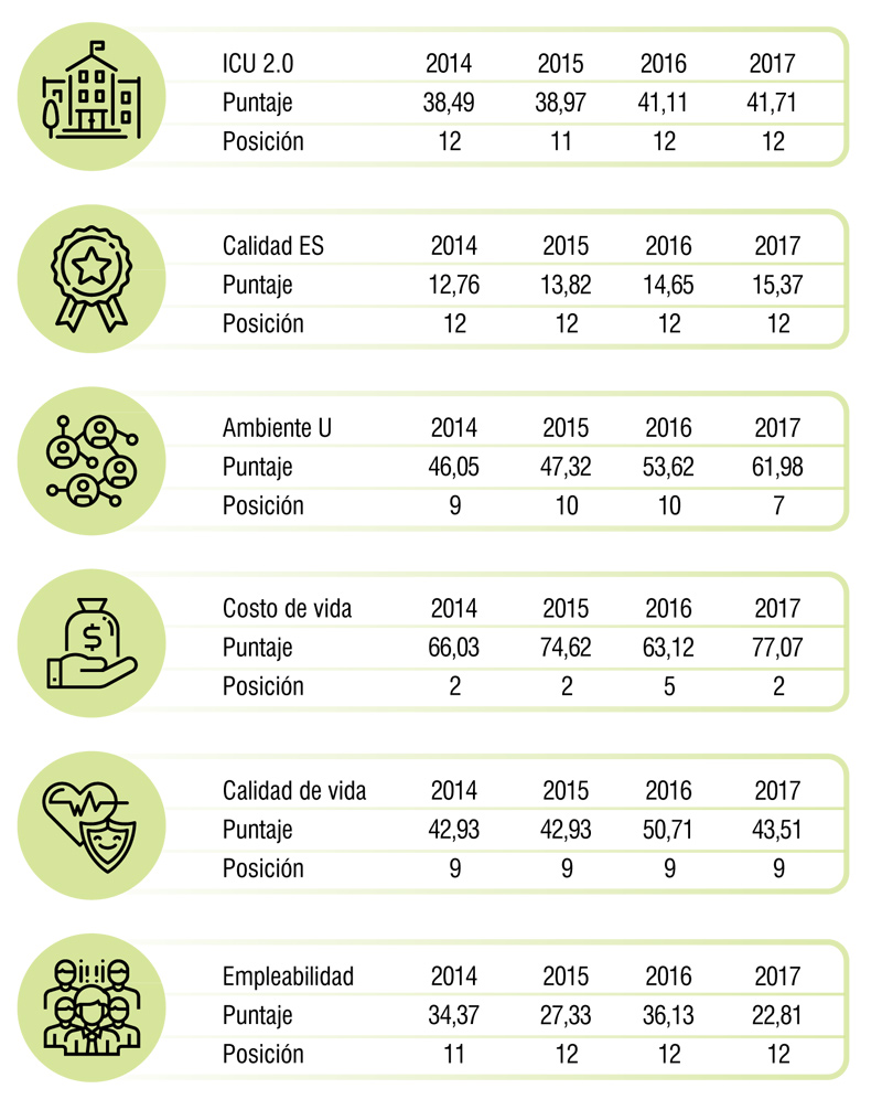 Según los resultados del ICU, el indicador que más subió para 2017 fue el de ambiente universitario (17 %), mientras el que más disminuyó fue el de empleabilidad (36 %).