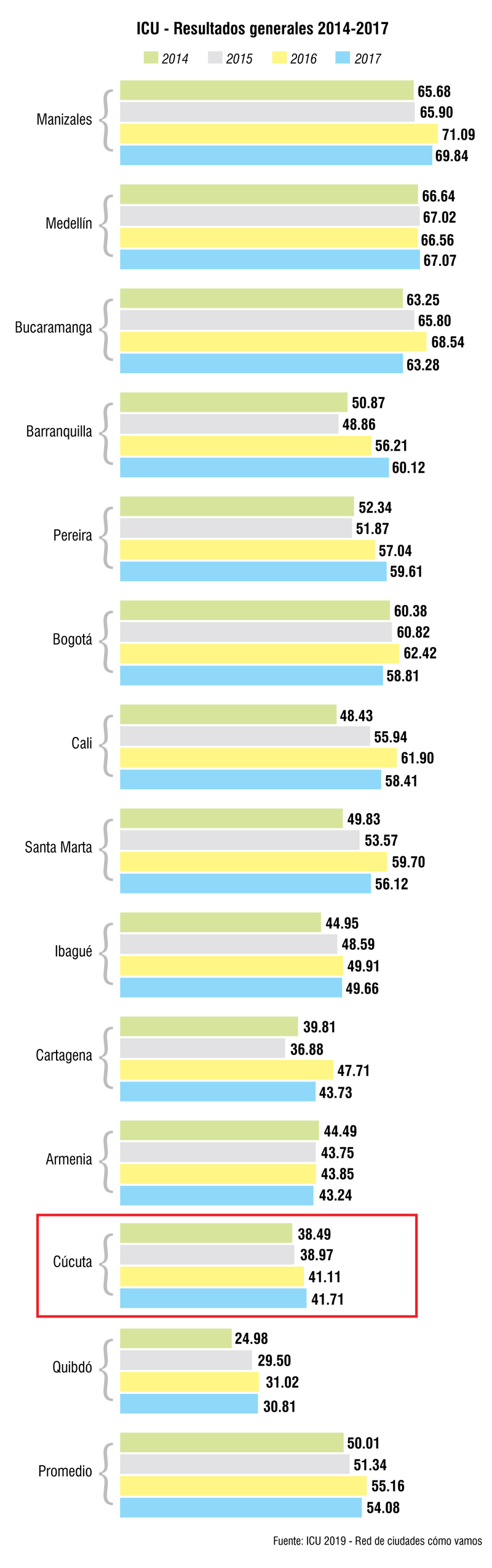 Cúcuta desde el 2014, que se entregan los resultados del estudio, siempre ha estado entre las tres últimas ciudades, a pesar de que ha mejorado levemente los resultados año tras año.