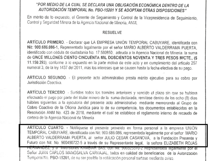 Sin embargo, lo que llama la atención de este proponente a operar el PAE, es una obligación económica con la Agencia Nacional de Minería, que se remonta al 2014.