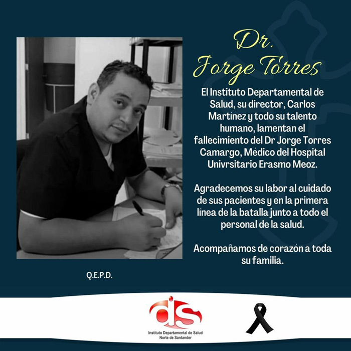 El gremio de los galenos y el sector salud de Cúcuta vuelve a estar de luto, pues en medio de la guerra contra la pandemia de coronavirus murió Jorge Torres Camargo, quien se desempeñaba como médico general en el Hospital Universitario Erasmo Meoz (Huem).