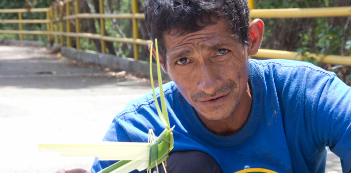 Nació en el barrio La Libertad y viviendo en la calle aprendió a hacer artesanías de hojas de palma, las cuales convierte en figuras de grillos y langostas en solo diez minutos.