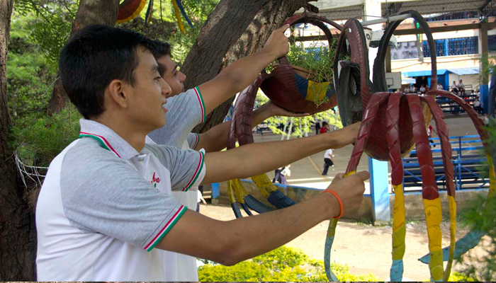Los jóvenes Dayron José Pérez Antolínez y Javier Peñaranda, de undécimo grado, retiran maleza y hacen mantenimiento a las macetas de caucho en forma de papagayo.