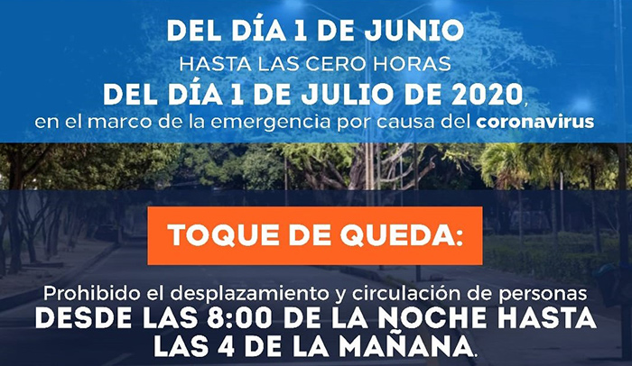 En cuanto al toque de queda, el cual restringe el desplazamiento y la circulación de la ciudadanía en todos sus municipios, se amplía desde el 1 de junio hasta el 30 de junio, desde las 8 de la noche, hasta las 4 de la mañana.