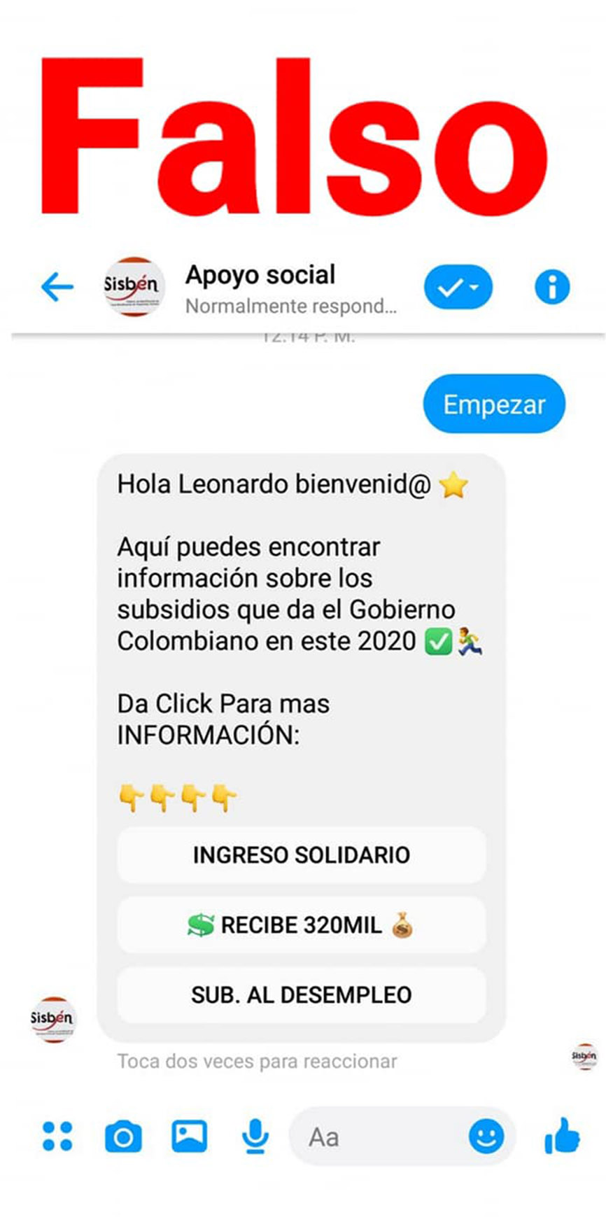 Una nueva modalidad de estafa se está registrando en la ciudad, en donde por medio de WhatsApp, Facebook y mensajería de texto, suplantadores bajo el perfil de funcionarios del Sisbén, ofrecen ayudas humanitarias del Gobierno Nacional, mediante supuestas convocatorias de la entidad