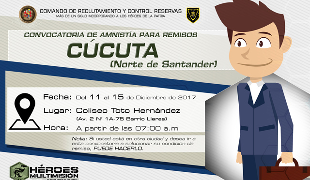 Entre el 11 y 15 de diciembre, el Coliseo Toto Hernández, en el barrio Lleras de Cúcuta, se convertirá en un despacho del Comando de Reclutamiento y Control del Reservas del Ejército Nacional, con el fin de permitir que quienes sean remisos puedan solventar esta condición.