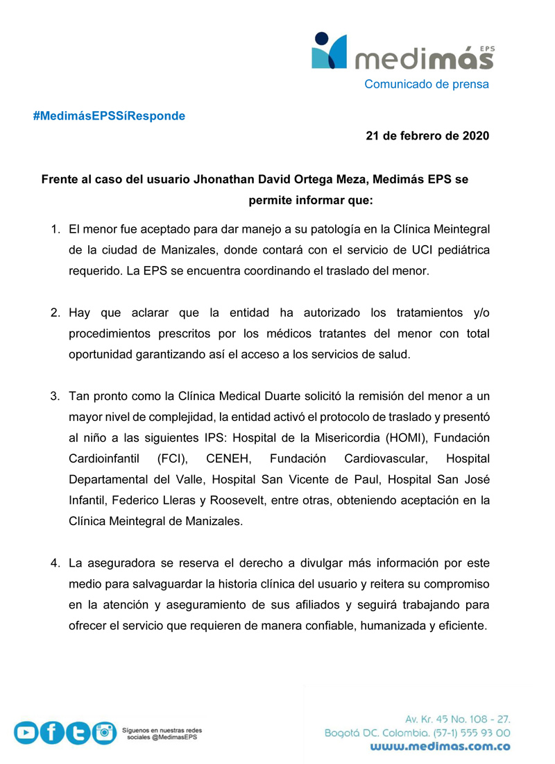 Añadió que en cuanto la clínica lo solicitó, la EPS activó el protocolo de traslado. Además, que han autorizado los tratamientos y procedimientos prescritos por los médicos de manera oportuna, garantizando los servicios de salud.