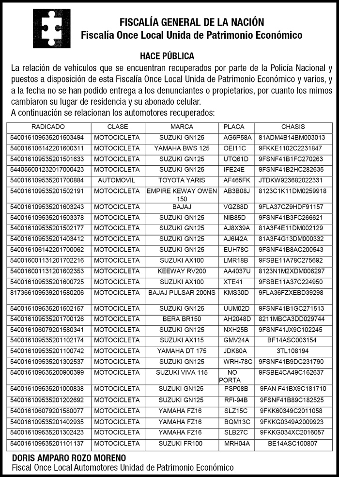 La Fiscalía General de la Nación emitió un listado de motocicletas que han sido recuperadas por la Policía Nacional, pues no han podido devolver los vehículos a sus dueños por la dificultad para localizar su residencia o número telefónico actual.