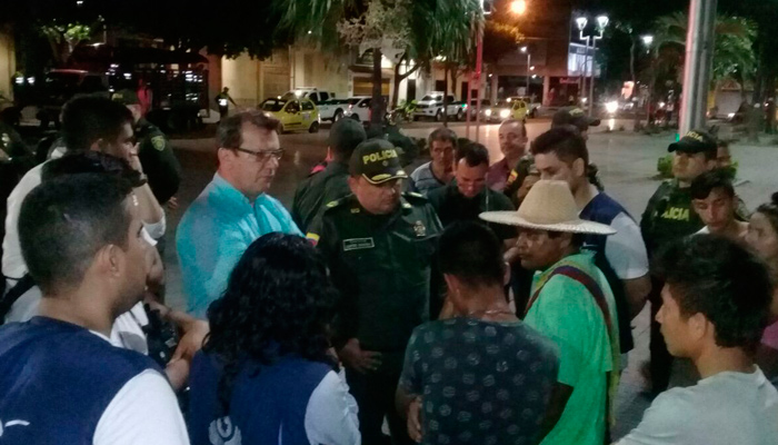 Representantes de la Policía y la Defensoría del Pueblo, así como el secretario de Seguridad Ciudadana llegaron al parque Santander para atender la llegada de los yukpa, entre los que ya habían contado 56 niños.