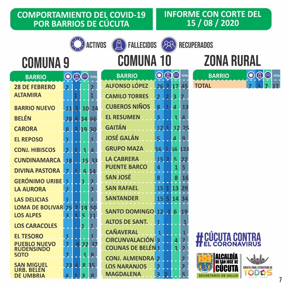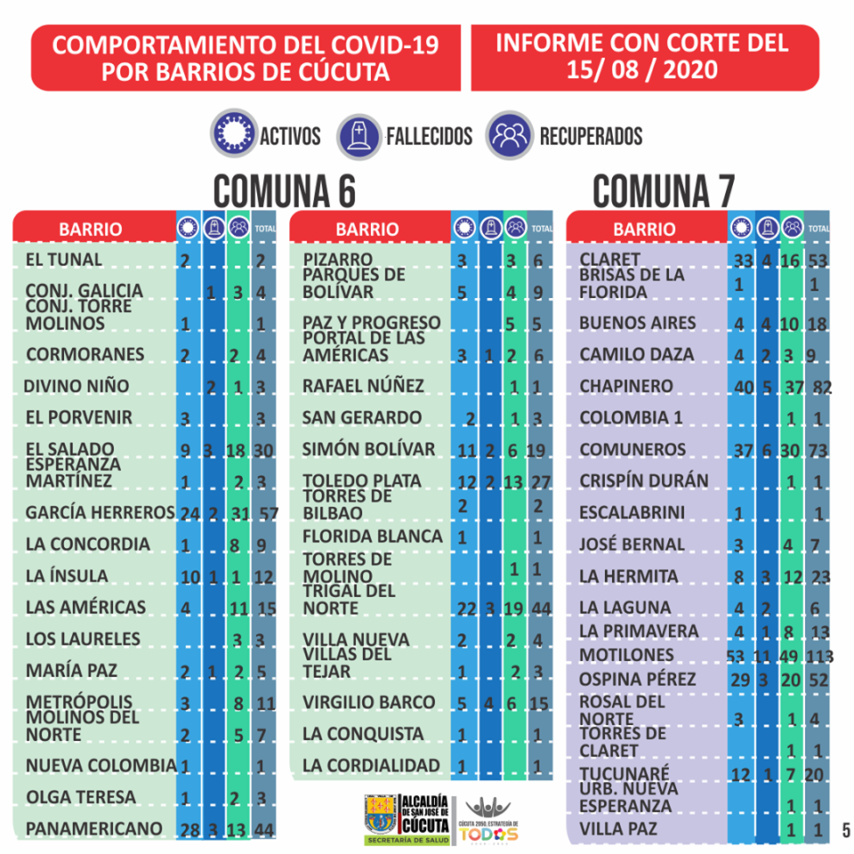 Este lunes, la Alcaldía de Cúcuta volvió a presentar el balance sobre el comportamiento de la pandemia de coronavirus por barrios. Se trata del cuarto informe semanal elaborado con los reportes emitidos por el Instituto Nacional de Salud (INS).