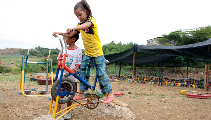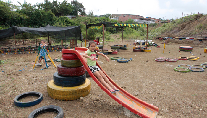 Allí, en un terreno escarpado, se construyó para ellos un parque, una pequeña huerta y una cancha, y en ello no se empleó un ladrillo ni una libra de cemento, todo se hizo con materiales reciclables, llantas viejas y juguetes viejos a los que se les puso color y un poquito de amor.