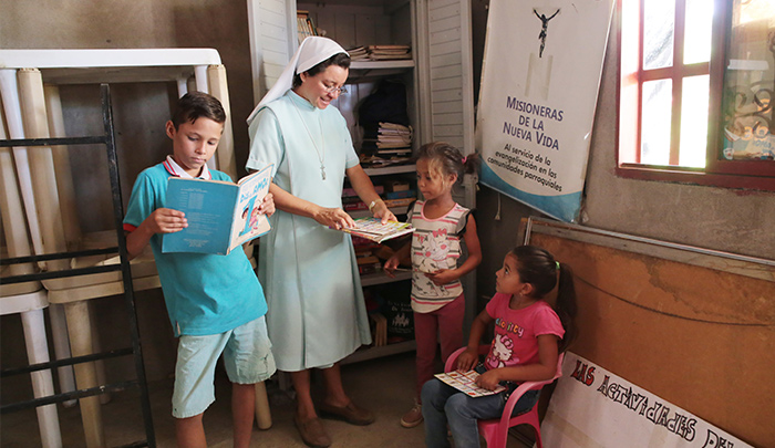 En un estante se conservan libros y materiales donados. La hermana Martha Isabel Celis Villamarín disfruta compartir sus conocimientos con los niños.