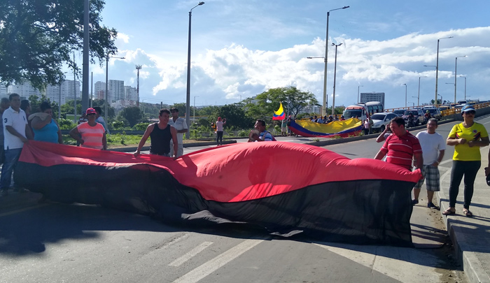 Con la bandera de Colombia y Cúcuta bloquean el paso. (Foto Kevin Beltrán /La Opinión)